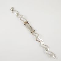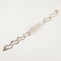 Bracelet en or gris 750 mil. à maille fantaisie orné d’une plaque pavée de diamants brillantés, fermoir cliquet avec huit de sécurité. (Petit accident au pavage, déformation, fermoir défectueux). (Longueur : 18,5 cm). 25,2 g. brut