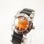 Bracelet-montre d’homme FRED « Gladiateur » en acier, boîtier rond à lunette tournante unidirectionnelle, cadran bicolore rouge et orange monogrammé à index bâtons et carrés, guichet dateur à 3H, mouvement quartz, sur bracelet en acier à maillons caoutchouc à boucle déployante papillon. Signé et numéroté. (Diamètre : 36,5 mm). (Tour de poignet : 16 cm environ). (Légères rayures).