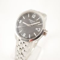 Bracelet-montre d’homme TISSOT « PRC 200 » en acier, boîtier rond, cadran noir à index bâtons et chiffres arabes, guichet dateur à 3H, mouvement quartz, sur bracelet en acier à boucle déployante en acier siglée. Signé et numéroté. (Diamètre : 40 mm). (Tour de poignet : 18 cm environ). (Légères rayures).