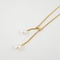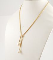 Collier négligé en or 750 mil. à fine maille palmier, retenant en pampilles deux perles de cultures (diamètre : 9,5 mm environ), et rehaussé de 3 diamants brillantés. (Tour de cou : 42 cm). 16,6 g. brut