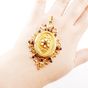 Pendentif médaillon ovale en or 750 mil. à décor ciselé et ajouré, rehaussé de grenats et de semences de perles. (Hauteur : 6 cm environ). (Petite déformation). 9,5 g. brut
