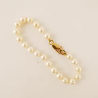 Bracelet d’un rang de perles de culture blanches, fermoir mousqueton en or 750 mil et anneau de bout en métal. (Longueur : 14,5cm ; Diamètre moyen perles : 5.5mm environ). 6,5 g. brut