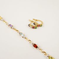Bracelet ligne 2 ors 750 mil serti de pierres fines ovales en sertis griffes (topazes, améthystes, citrines, grenats, péridots). (Longueur : 18cm). 5,5 g. brut Paire de boucles d’oreilles en or 750 mil ornées de saphirs, rubis, émeraudes et diamants taille 8/8. Systèmes pour oreilles percées. (Hauteur : 1cm). (Egrisures). 1,7 g. brut Poids total brut : 7,2 g.