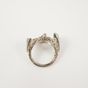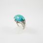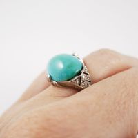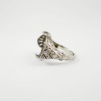 Monture de bague en platine 950 mil à motifs feuillagés ciselés et motifs géométriques sertis de diamants tailles 16/16 et 8/8. Incomplète, manques. Travail français, époque Art Déco. (TDD - avec système de mise à grandeur : 51 ; Dimensions chaton : 2,3x1,6cm environ). 7,4 g. brut Joint : Un cabochon de pierre décorative bleue teintée. Poids total brut : 10 g.