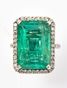 Bague en or gris 750 millièmes ornée au centre d’une émeraude rectangulaire à pans coupés dansun entourage de diamants ronds de taille brillant. (Égrisures et une griffe accidentée). Tour de doigt : 55. Poids brut : 16,4 g. Accompagnée d’un rapport CGL no 26141/NP198 de mars 2022 précisant : - Masse : 15,42 ct - Couleur : Vert intense - Provenance : Zambie - Imprégnation mineure constatée (huile) - Dimensions : 19,18 × 13,11 × 7,71 mm