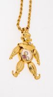 CHOPARD. Collier articulé en or jaune 750 millièmes retenant en pendentif un motif en or jaune 750 millièmes figurant un arlequin, le centre renfermant deux diamants ronds de taille brillant et un rubis mobile sous verre. Signé sur les deux éléments. Numéroté sur le pendentif. Longueur : 58,5 cm environ Hauteur du pendentif : 3 cm Poids brut total : 18,5 g