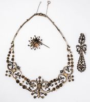 Collier articulé en argent 925 millièmes et or 750 millièmes, le centre orné de motifs à décor d’agrafes de feuillages, entièrement sertis de diamants taillés en rose, sur clinquant. Certains motifs peuvent se détacher. (Égrisures et manques, la chaînette de sécurité en métal). Travail français du xixe siècle.Poids brut : 77,9 g. On y joint des maillons, une boucle d’oreille et une broche en argent 925 millièmes ornés de pierres d’imitation blanches. (Égrisures et manques). Travail français du xixe siècle. Hauteur : 7,2 cm. Poids brut : 19,2 g