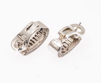 Paire de boucles d’oreilles, chacune de forme bombée ornée de lignes de diamants rectangulaireset ronds de taille brillant. Système pour oreilles percées. (Usures). Hauteur : 1,8 cm. Poids brut : 14,2 g