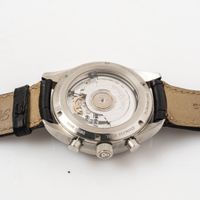BELL & ROSS Montre d’homme ronde chronographe en acier. Cadran noir à chiffres arabes. Aiguilles et index luminescents. Deux sous-compteurs et guichet date à 4h. Mouvement mécanique à remontage automatique signée. Base ETA 2894-2. Diamètre : 39 mm environ. Bracelet cuir (*) signé avec boucle déployante signée. Référence 126.A.S. Boîtier No 13225. Sans écrin ni papiers.