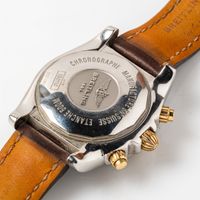 BREITLING, Chronomat 44. Montre d’homme ronde chronographe en acier avec lunette tournante bidirectionnelle. Cadran noir à trois sous-compteurs champagne, guichet date à 4h. Index et aiguilles luminescents. Mouvement mécanique à remontage automatique. Diamètre : 44 mm environ. Bracelet cuir signé avec boucle ardillon signée. Référence IB0110. Boîtier No 3021092. Écrin, certificatde chronométrie, carte de garantie en date du 01/09/2017. E) (art. 524 bis du CGI, al.C)