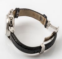 BURAN, V.M. Montre d’homme ronde russe chronographe en acier. Cadran gris bi-ton à trois souscompteurs, guichet jour et mois à 12h, phases de lune à 6h et calendrier par pointeur. Indexappliqués et aiguilles luminescentes. Mouvement mécanique à remontage automatique signé,calibre base Valjoux. Diamètre : 40 mm environ. Bracelet cuir (*) avec boucle déployante signée.Boîtier No 090/100. Sans écrin ni papiers.