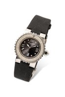 CHAUMET, Class One. Montre de femme ronde en acier, lunette tournante sertie de diamants. Cadrananthracite à index diamants et chiffres romains, aiguilles luminescentes et guichet date à 6h. Mouvement quartz. Diamètre : 33 mm environ. Bracelet tissus signé avec boucle déployante signée. Boîtier No 622 21260. Écrin et pochette de voyage.