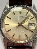 ROLEX, Datejust. Montre d’homme ronde en acier. Fond de boîte Référence 1600. Cadran beige« sigma » à index et aiguilles en or jaune 750 millièmes, guichet date à 3h, point et aiguilles luminescents. Mouvement mécanique à remontage automatique. Calibre 1570. Diamètre : 36 mm environ. Bracelet cuir (*) avec boucle dorée non signée, référence 1603. Boîtier No 5246033. Sans écrin ni papiers.