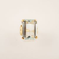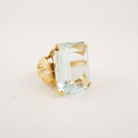 Bague en or rose 750 mil ornée d’une importe aigue-marine rectangulaire à pans coupés de 16 carats environ (TDD : 52). Travail français. 12,4 g. brut.