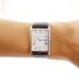 Montre-bracelet d’homme ZENITH en acier, boîtier rectangulaire, cadran blanc à chiffres romains, mouvement mécanique, sur bracelet en cuir noir à boucle ardillon en acier siglée (dimensions du boîtier : 25 x 35 cm environ).