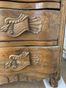 Commode dite « du Royans à mannettes » en noyer mouluré et sculpté, à façade arbalète, ouvrant à trois rangs de tiroirs, poignées de tirage et traverse inferieure à cartouche coquille feuillagé, plateau en bois, entrées de serrure rondes dont deux factices, pieds antérieurs légèrement cambrés. Travail régional du XVIIIème siècle. Dimensions : 86 x 131 x 63 cm. (Restaurations, en l’état)