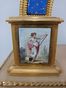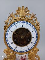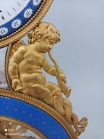 PENDULE SQUELETTE en bronze ciselé et doré à décor de palmettes et feuillages et décor émaillé. Cadran annulaire émaillé blanc dévoilant le mouvement épaulé de deux amours tritons soufflant dans des trompes. Montant en plein cintre à fond émaillé d’étoiles dorées sur fond bleu et rehaussé dans des réserves d’émaux polychromes à décor d’Apollon et de nymphes. Base rectangulaire en marbre blanc à décor de frise de putti dans le goût de Clodion sur des pieds toupies en bronze. Balancier à décor d’un masque d’Apollon et une clef. Époque Directoire. H. 50 × L. 28,8 × P. 13,5 cm. (Petits accidents et restaurations, mouvement à réviser