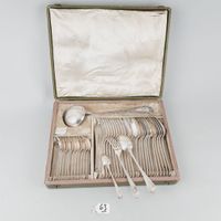ALFENIDE, Fin du XIXe siècle : ménagère de 37 pièces en métal argenté, modèle piriforme à filet et agrafes de rinceaux feuillagés comprenant 12 grandes fourchettes, 12 grandes cuillers, 12 cuillers à café et 1 louche. Monogrammée RG. Signée. Poinçon de fabricant au bouc. Ecrin défraichi. L. d’un couvert : 21.5 cm. L. d’une petite cuiller : 15 cm. Légères rayures. TBE de fraicheur.