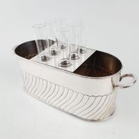 CHRISTIAN DIOR, XXe siècle : Rafraichissoir double pour service à caviar en métal argenté de forme rectangulaire à décor de godrons avec séparations intérieures et support pour 6 verres à vodka. Signé C. DIOR Paris. Made Italy. L. aux anses : 41 cm. H. 14.5 cm. largeur : 14.2 cm. H. verre : 12 cm. Manque une petite glissière supérieure interne. TBE général. + Petite pince à sucre en métal argenté anglais. L. 11.4 cm.