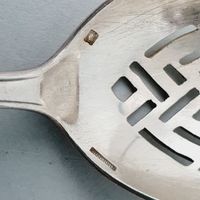 CHRISTOFLE, PRINTANIA, ANNEES 1930 : suite de 6 pièces à hors d’œuvre en métal argenté comprenant 1 pelle à cornichons (L. 17 cm), 1 cuiller à olives, 1 fourchette à viande, 1 Fourchette à dessert, 1 pelle, 1 fourchette à mini asperges (L. 15.2 cm). Signée. Poinçon CC de la période 1862-1935. Non chiffrée. Rayures. Les couverts Printania ont été dessinés par Joseph-Elie CAZES pour équiper les restaurants des grands magasins du Printemps à Paris en novembre 1923. Ils ont été présentés à l'exposition des Arts et Techniques de Paris en 1937. Au catalogue Christofle de 1925 à 1938.