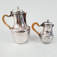 Deux petites verseuses dont une égoïste chiffrée en argent 950 mil. à fond plat et anses à osier tressé, les becs carrés, les couvercles thermos à petite bille interne. Minerve 1er titre de 1838. Poinçon de Maître d’Edmond TETARD partiellement lisible sur la plus grande aussi numérotée. Bosses et rayures d’usage. H. 10.3 et 15.2 cm. Poids brut total : 334.5 g (dont pour l’égoïste 108.3 g et celle TETARD 226.2 g).