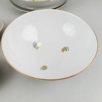 ROYAL LIMOGES, Fin du XXe siècle, Années 1990 : service de table de 45 pièces en porcelaine fine blanche, modèle Récamier à liseré or et décor bucolique de fleurs et oiseaux de Paradis comprenant 12 assiettes de table (diam. 26 cm), 12 assiettes creuses (diam. 22.5 cm), 12 assiettes à dessert (diam. 18.5 cm), 1 soupière (H. 18 cm - diam. 26.5 cm), 1 saladier (diam. 24.5 - H. 9.5 cm), 2 raviers (L. 23 cm), 1 saucière (dim. 7.8 x 21.5 cm), 1 grand plat rond (diam. 30 cm), 1 plat rond creux (diam. 29 cm - H. 6 cm), 1 plat ovale (L. 40 cm) et 1 plat rond à petites oreilles (L. 29.5 cm). Signé. Monogramme HJ en lettres anglaises sur chaque pièce. TBE. Quasi neuf. A rapprocher du lot 43 de la vente. ROYAL LIMOGES est la plus ancienne fabrique de Limoges en activité depuis 1797. Des Hôtels Crillon, George V, Ritz et des grands noms de ce monde ont fait confiance à la renommée de la manufacture.Il s’agit d’une commande spéciale faite en 1995 (cf. ordre de livraison du transporteur).