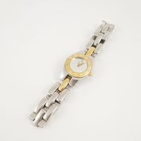 Bracelet-montre de dame BAUME & MERCIER « Linéa » en acier et or 750 mil, boîtier rond, lunette gravée à chiffres arabes, cadran muet miroir, mouvement à quartz, fond vissé, sur bracelet à maillons articulés en acier et or 750 mil, boucle papillon déployante signée. (Diamètre boîtier : 24 mm, tour de poignet : 16cm). (Exemptée article 524 bis du CGI, al. C). 56,2 g. brut.