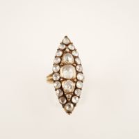 Importante bague marquise en or 375 mil. sertie de roses. (TDD : 55,5, longueur : 3,8 cm environ) (Traces de soudures). 9,5 g. brut.