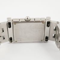Montre-bracelet de dame VAN CLEEF & ARPELS « Façade » en acier, boîtier rectangulaire architecturé, cadran blanc à chiffres romains, fond vissé, mouvement à quartz, sur bracelet et boucle ardillon en acier non signée. (Dimensions boîtier : 31x21mm environ). (Légères rayures).