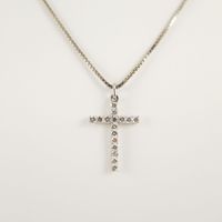 Pendentif Croix BOUCHERON en or gris 750 mil. serti de diamants brillantés. Signé et numéroté. (Hauteur : 2,5 cm environ). On y joint un Collier en or gris 750 mil. à maille vénitienne. (Longueur : 59 cm). 9,4 g.