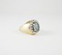 Bague 2 ors 585 mil centrée d’une aigue-marine dans un entourage de diamants taille brillant. (TDD : 51 ; Largeur : 1,5cm). (Egrisures, traces de mise à taille). 7,4 g. brut