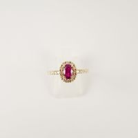 Bague en or 750 mil centrée d’un rubis ovale, entourage et épaulement sertis de diamants taille brillant. (TDD : 52). (Egrisures). 3,1 g. brut