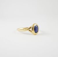 Bague en or 750 mil centrée d’un saphir ovale en serti clos. Travail français. (TDD : 62). 3,4 g. brut