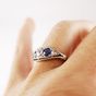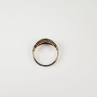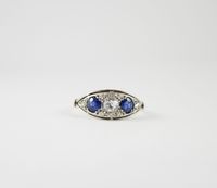 Bague « navette » en or gris 750 mil sertie d’un diamant taille ancienne de 0.20ct environ, entre de deux saphirs ronds et diamants taillés en roses. Travail Art déco. (TDD : 54 ; Largeur : 8mm). (Soudures, égrisures, petits manques de matière). 3,5 g. brut