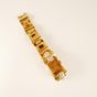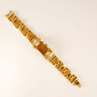 Bracelet-montre de dame Tank en or jaune et or gris 750 mil, boîtier rectangulaire convexe, tranches ciselées de motifs floraux, attaches rehaussées de diamants taille 8/8, cadran doré à chiffres arabes, fond clippé, mouvement mécanique, sur bracelet à maillons rouleaux ajourés articulés en or 750 mil. Travail des années 1940.(Longueur : 16cm). (Petits manques de matière, verre égrisé). 50,8 g. brut