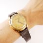 Montre-bracelet d’homme JAEGER LECOULTRE en or 750 mil, boîtier rond, lunette lisse, cornes à pans coupés, cadran doré à chiffres arabes, fond clippé, mouvement mécanique (calibre P478), sur bracelet cuir marron usé non d’origine sans boucle. (Diamètre boîtier : 35mm). (Manque remontoir et trotteuse centrale, cadran taché et craquelé, en l’état). 36,7 g. brut