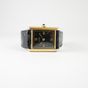 * Montre-bracelet Must de CARTIER « Tank » en vermeil 925 mil, boîtier rectangulaire, cadran noir à chiffres romains, index losangiques et chemin de fer pour les minutes émaillés dorés, fond vissé, mouvement à quartz, pierre de synthèse cabochon bleue au remontoir, sur bracelet cuir noir usé et boucle déployante en métal doré signée. Signée et numérotée. Sans écrin ni papiers. (Dimensions boîtier : 30x23mm). (Usures, rayures, égrisures). 27,6 g. brut