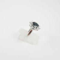 Bague « Pompadour » en or gris 750 mil. centrée d’un saphir taille ovale de 0,70 carat environ dans un entourage de diamants brillantés. (TDD : 55). 4,2 g. brut