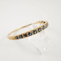 Bracelet rigide ouvrant en or 375 mil serti d’une chute de saphirs ronds alternés de petits diamants, avec chaînette de sécurité et huit de sûreté. Travail anglais. Poinçon ET. (Longueur : 16,5 cm environ) (chaînette de sécurité à re-fixer). 12,6 g. brut.