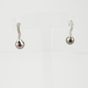 Paire de pendants d’oreilles ornés d’une perle de culture grise poire (diamètre : 9,5 et 9,7 mm) retenue par une ligne sinueuse en or gris 750 mil sertie d’un petit diamant brillanté (hauteur : 3 cm environ). 4,6 g. brut.