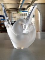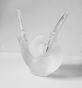 LALIQUE ® France, production contemporaine : bouquetière en cristal satiné amati et lisse moulé pressé figurant un couple de colombes entrelacés aux ailes déployées, la partie centrale amovible formant pique-fleurs. Signée. Micro-rayures. TBE. H. 21, 4 cm.