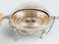 MARTIN HALL & Co (actif 1854-1936), Sheffield, vers 1900-1910 : Beurrier anglais ovale quadripode à réservoir pour le froid en métal argenté, le couvercle en dôme à système basculant, petit plateau ajouré amovible à l’intérieur. Il repose sur pieds et attaches à têtes de bélier, le tour à guirlande de lauriers et rosaces. Crest anglais au sanglier sur petit écu armorié. L. 22,3 cm. Largeur : 13,3 cm. H.13,5 cm. Choc visible sur le couvercle, rayures d’usage et manques. En Angleterre, les pièces de forme de ce type faisaient partie du service pour le petit-déjeuner et s’appellent les Breakfast Domes.