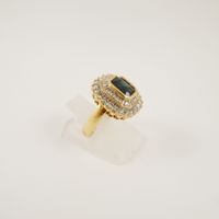 Bague 2 or 750 mil. centrée d’un saphir rectangulaire à pans coupés dans un double entourage de diamants brillantés et 8/8, travail français (TDD : 48,5) (dimensions : 1,5 x 1,4 cm environ) (petits éclats). 5,2 g. brut