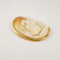 Broche en or 750 mil. à décor floral ciselé, centrée d’un important camée coquille représentant une scène religieuse (dimensions : 5,8 x 4,6 cm environ) (déformation à l’épingle, soudures sur une armature en métal, transformation). 17,9 g. brut