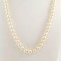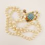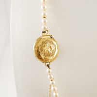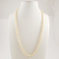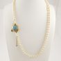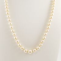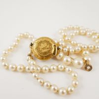 Collier d’un rang de perles de culture en chute, fermoir en or 750 mil. ciselé centré d’un dôme pavé de cabochons de turquoises, chaînette de sécurité en or 750 mil. également (longueur : 52,5 cm environ) (diamètres : de 4,2 à 7,8 mm environ) (fermoir transformé, légère déformation). 25,5 g. brut