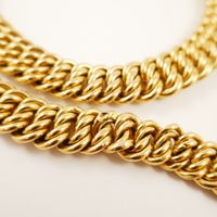 Collier en or 750 mil. à maille US en chute, travail français (longueur : 45,5 cm environ) (largeurs : de 1,2 à 1,6 cm environ) (chocs, déformations). 44,2 g.