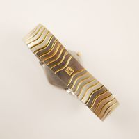 [Exempté : art. 524 bis du CGI al. c] Bracelet-montre EBEL « Classic Wave » en acier et or 750 mil., boîtier rond, lunette sertie de vis, cadran doré, index bâton appliqués émaillés noir, mouvement à quartz, bracelet et boucle déployante signée en acier et or 750 mil., signé et numéroté, réf. 1823 (diamètre : 32 mm environ) (longueur : 17 cm environ) (tout petits chocs à la lunette). 61,9 g. brut