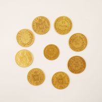 9 pièces de monnaie en or 900 mil : dont 8 x 20 FRF (datées : An 13, 1857, 1859, 1867 et 1868), et 1 x 10 FRF (datée : 1867). 54,6 g.