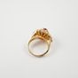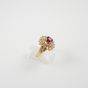 Bague fleur en or 585 mil centrée d’une pierre de synthèse rouge entourée de diamants brillantés (1,50 ct environ au total) (TDD : 49,5) (diamètre du chaton : 1,5 cm environ). 7,5 g. brut.