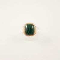 Bague ISABELLE LANGLOIS en or rose 750 mil centrée d’une malachite taille coussin dans un entourage de diamants brillantés, épaulée de cabochons de nacre (TDD : 49 avec boules de mise à grandeur internes). Poinçon de maître. (Egrisures). 5,9 g. brut.
